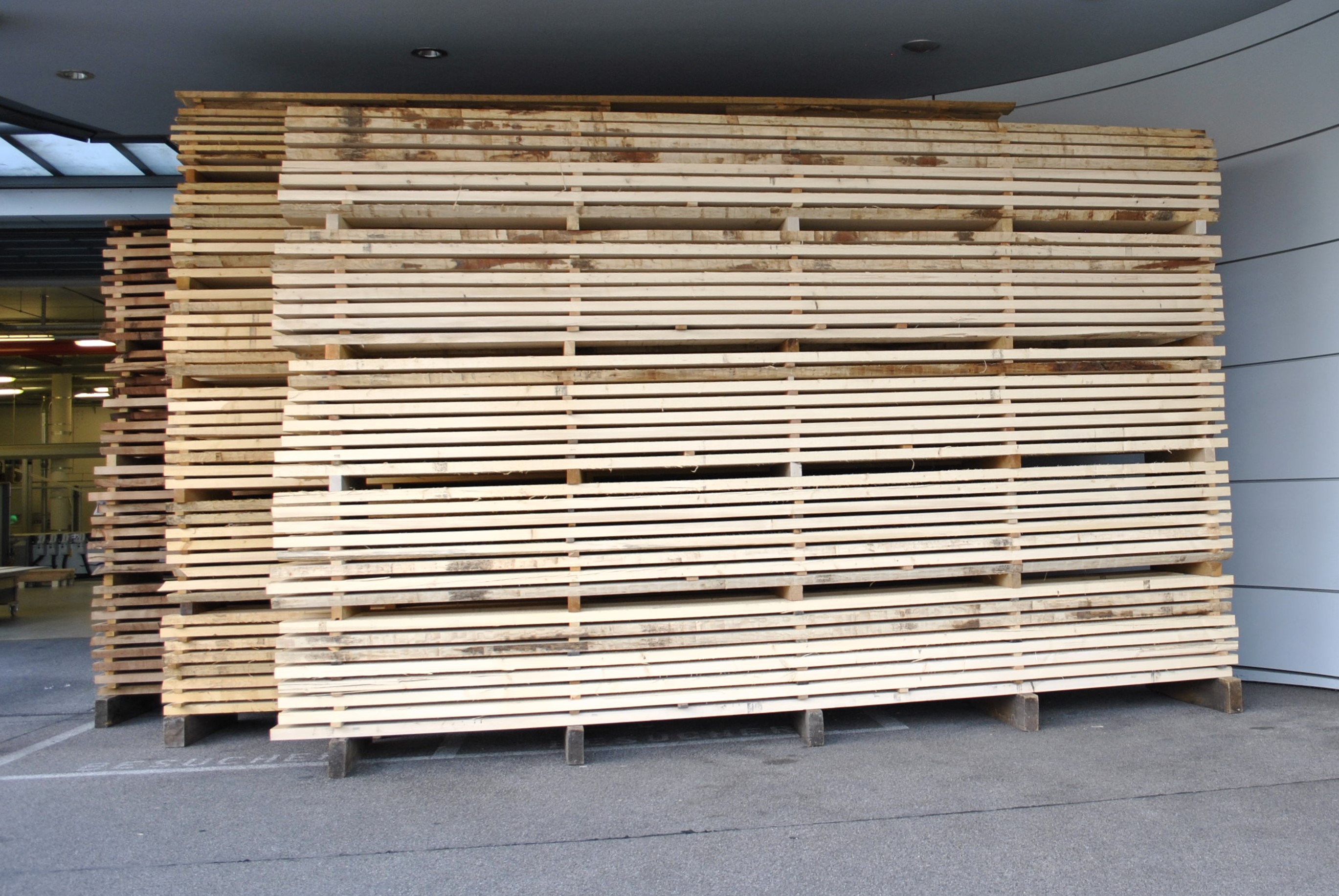 Nach dem Einschlag gelangen die Stämme zur Sagerei Koller in Attelwil, wo sie fachgerecht zugeschnitten werden. Anschliessend werden die Bohlen im Freien luftgetrocknet, bevor sie im Inneren künstlich getrocknet werden, um die optimale Restfeuchte zu erreichen.